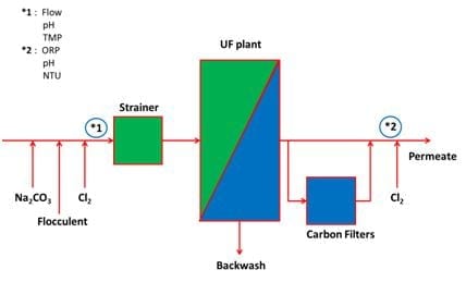 Chemical injection is done on the feed line which feed into a buffer tank for the UF plant. This feed through a strainer that removes the coarse particles. The strainer is a protection precautionary measure for the UF membranes. From the UF plant the permeate flows into a filtrate tank. A waste sump is connected to the UF plant for backwash collection.