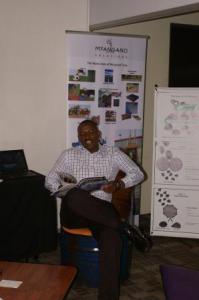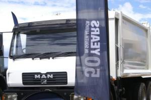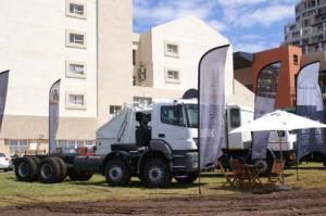 Left: More reading of ReSource. Euguen de Wet from MTM said it filled the gaps at the stand.Right: A snapshot of the outside exhibition with Mercedes Benz exhibiting their trucks.